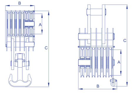 | 產(chǎn)品型號 | 名稱 | 鋼絲繩直徑 (mm) | 額定載荷 (t) | A (mm) | B (mm) | C (mm) | 自重 (kg) |