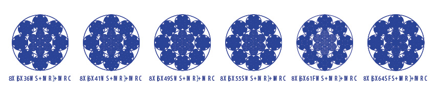 繩結(jié)構(gòu):8X[6X36WS+IWR]+IWRC 8X[6X41WS+IWR]+IWRC 8X[6X49SWS+IWR]+IWRC 8X[6X55SWS+IWR]+IWRC 8X[6X61FWS+IWR]+IWRC 8X[6X64SFS+IWR]+IWRC